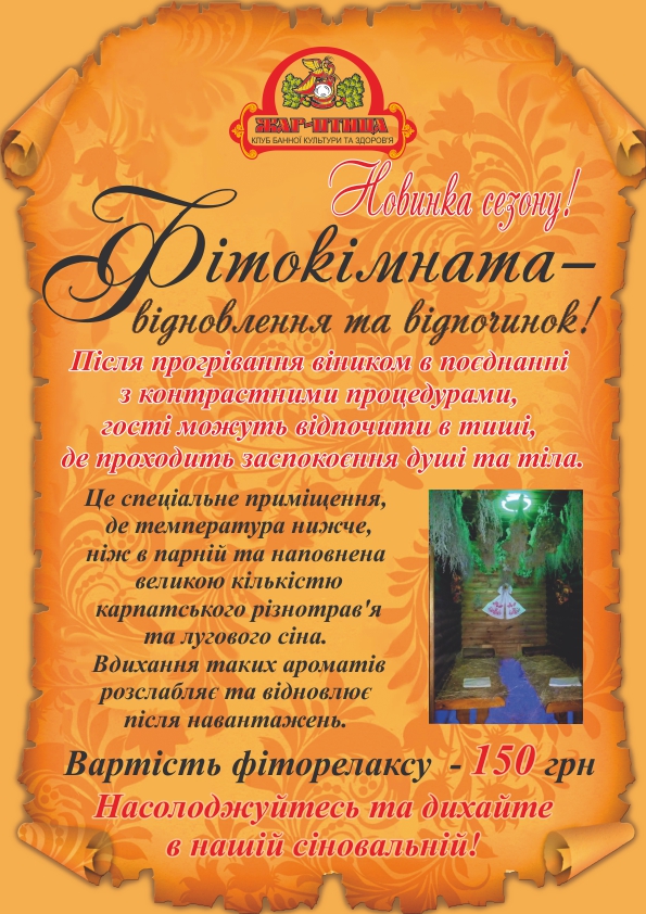 Фітокомната - відновлення та відпочинок! Після прогрівання віником на банній полиці в поєднанні з контрастними процедурами, гості можуть відпочити в тиші, де проходить заспокоєння душі і тіла.